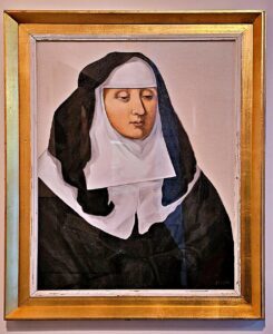 The museum’s permanent collection showcases historical medical equipment alongside examples of the nuns’ religious arts practices. In one room, a ceramic vessel for leeches is mounted across from a case with cloth masks that would be doused with ether for anesthetization. There are shiny forceps and a needle so large it looks almost cartoonish. On the floor below, Catholic relics are arranged in glass cases. Each relic is about the size of a bottle cap and contains a scrap of human tissue, bone, or hair surrounded by intricate beading and embroidery enclosed within a broach-like case. These decorative pieces are part of a Catholic tradition, which includes preserving a piece of the venerated body of a saint or holy person. Small relics, like the ones described above, were made to be worn by their owners. The intimate proximity is meant to offer protection, solace, healing, and perhaps to allow a little holiness to literally rub off on the wearer.